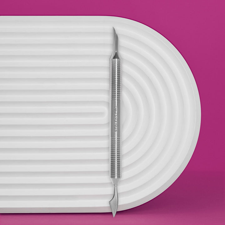The working part, “slant pusher,” is used to lift and push back a rough and strongly stuck cuticle, clean the free edge of the nail, remove gel polish streaks.