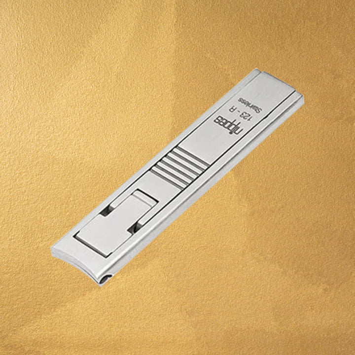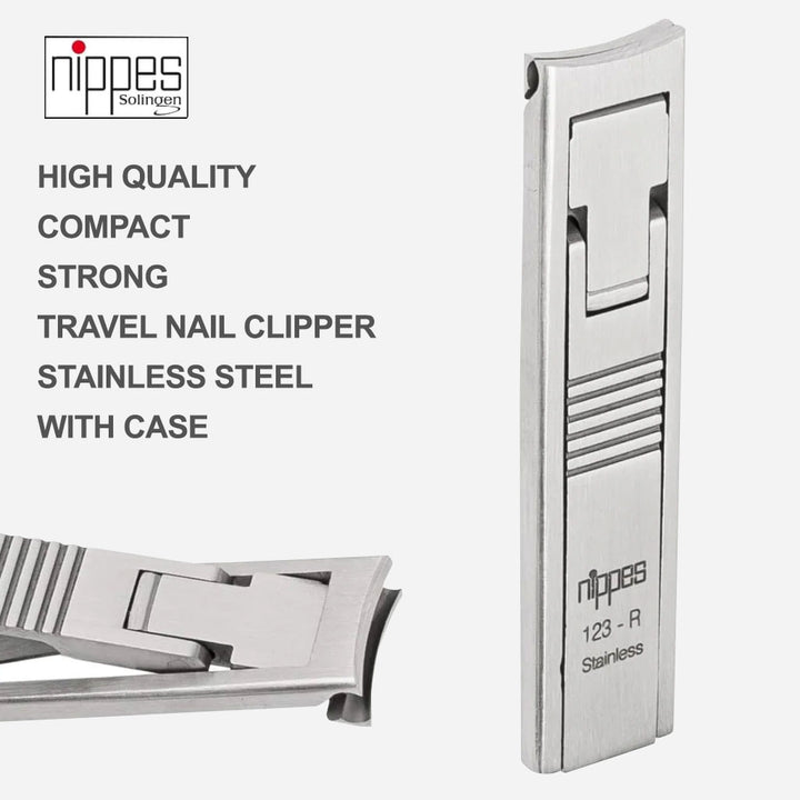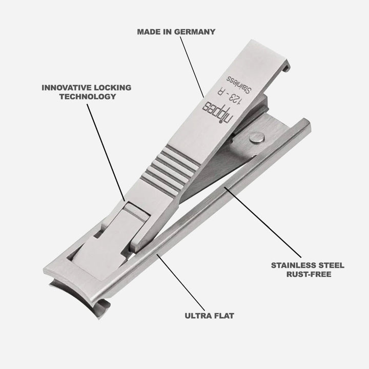 Ultra flat nail clippers with innovative locking technology. Slide it up and the nail can be clipped off.