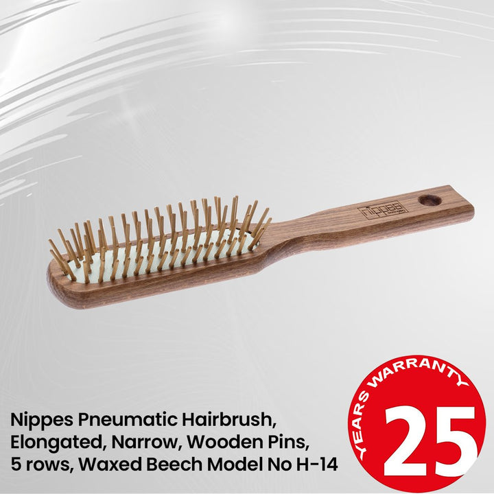 Nippes Pneumatic Hairbrush, Elongated, Narrow, Wooden Pins, 5 rows, Waxed Beech Model No H-14