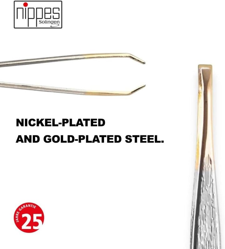 Nippes Tweezers 9SGP, angled, gold-plated - Slicker Tweezers from Solingen Made in Germany Eyebrow Tweezers for Face Care for Plucking Eyebrows, Beard Hair or Small Hairs for Men and Women (Cranked / Gold-Plated)
